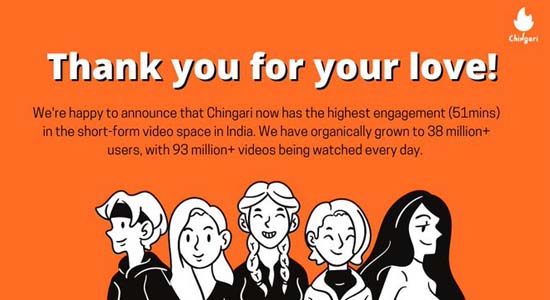 चिंगारी ऐप के यूजर्स की संख्या 38 मिलियन के आंकड़े को पार कर चुकी है। चिंगारी ऐप पर रोजाना 95 मिलियन वीडियोज को देखा जाता है।
