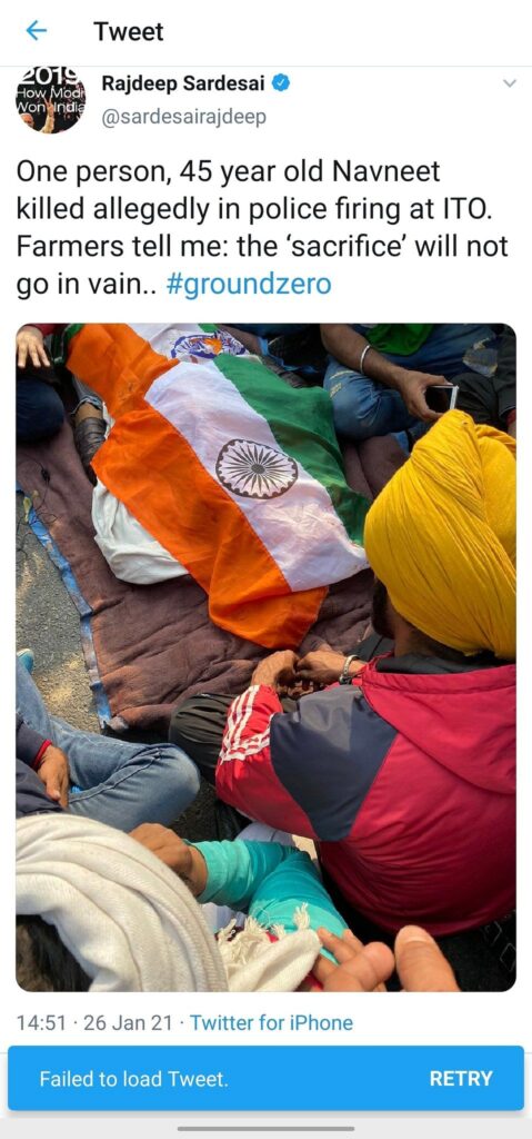 72 वाँ गणतंत्रा दिवस ऐसे ज़ख्म दे गया है जिसका दर्द लगातार टीस मार रहा है अंतरात्मा अंदर ही अंदर रो रही है कि किस तरह से पूरी दिल्ली को बंधक बना लिया गया और लाल किले पर कब्जा कर वहाँ अपने झण्डे लगा दिए गए सैकडों पुलिस वालों ने 20 फीट गहरी खाई में कूद कर जान बचाई, कितनो के सिर फूटे तो कितनो के हाथ पाँव टूटे कैसा नंगा नाच हुआ और हम सब बस खामोश सब कुछ होते देखते रहे, शर्म की बात यह है कि इसमें मीडिया की भूमिका भी शर्मनाक रही वह तो चुस्त दुरुस्त प्रशासन की समझदारी रही नहीं तो ‘‘इंडिया टूडे के राजदिप सरदेसाई’’ ने तो लाशें बिछवाने की पूरी तैयारी कर दी थी उन्होंने भीड़ को भड़काने के लिए सीधे-सीधे पुलिस की गोली से किसान की हत्या की ख़बर दे दी और अपने चैनल इंडिया टूडे पर टेलिकास्ट भी करवा दिया जिससे स्तिथि भड़कीं लेकिन शीघ्र ही प्रशासन ने सच सामने ला कर हालात को भयावह होने से बचा लिया…….
