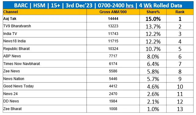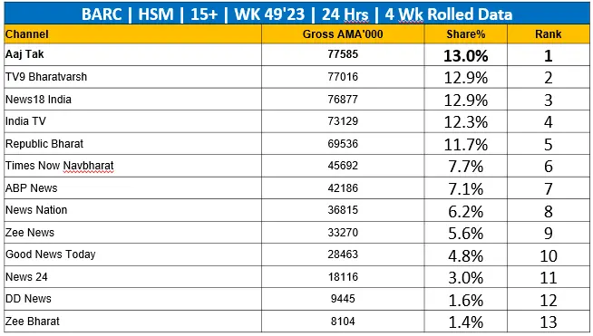 During the four-week rolling average from weeks 46 to 49, Aaj Tak clinched the top spot with an impressive 13 percent market share, accumulating 77,585 Gross AMA’000 viewers. Hot on its heels were TV9 Bharatvarsh and News18 India, closely securing the second and third positions with 12.9 percent market shares and notable viewership figures of 77,016 and 76,877 Gross AMA’000 respectively.