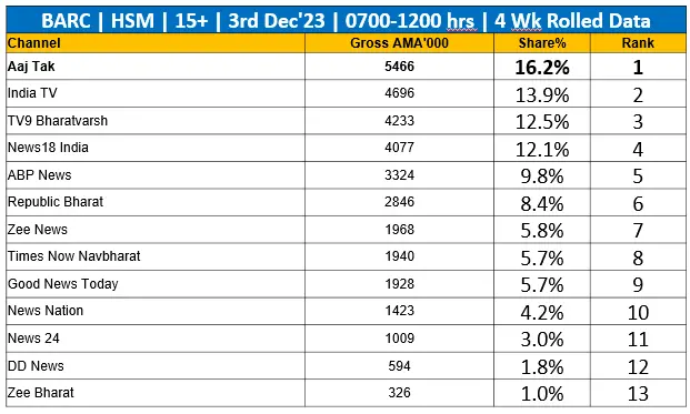 However, the highlight of Aaj Tak’s triumph unfolded on December 3, 2023, the pivotal counting day for the state elections, specifically during the crucial time frame of 0700-1200 hrs. Aaj Tak fortified its lead with a commanding 16.2 percent share, amassing 5466 Gross AMA’000 viewers during this critical period, solidifying its position as the go-to channel for election coverage.
