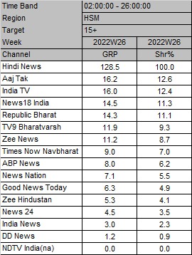 Aaj Tak, the Hindi news channel from the India Today Group, has emerged as the top channel with 16.2 GRP and share percentage of 12.6 in the BARC Week26 of 2022.