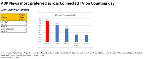 Recent data disclosed by Chrome Digital Track highlights ABP News’s supremacy as the preferred choice for viewers seeking comprehensive and trustworthy coverage across various Connected TV platforms.