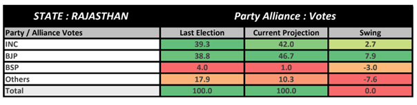 Rajasthan: The ABP News-CVoter Opinion Poll suggests a return to power for the BJP in Rajasthan after five years. The BJP is projected to secure 127-137 seats out of 200, with a vote percentage of 46.7%, as compared to Congress’ 42%.