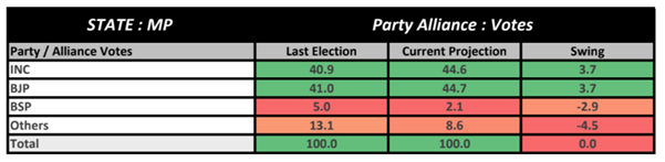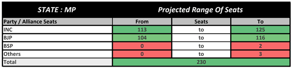 Madhya Pradesh: Madhya Pradesh is expected to witness a closely contested battle between the ruling BJP and Congress, with the latter leading in seats but falling short of a clear majority. The Congress is projected to win 113-125 seats, while the BJP could secure 104-116 seats, with a marginal vote percentage difference of 44.7% for the BJP and 44.6% for INC.