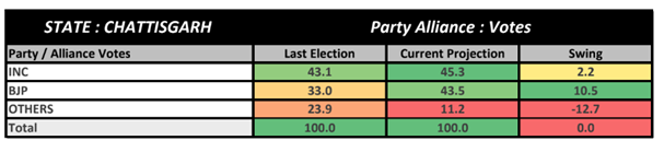 Chhattisgarh: In Chhattisgarh, the ruling Congress faces anti-incumbency but still holds an edge, although with a reduced seat projection compared to the previous elections. The Congress is predicted to win 45-51 seats, down from 68 in 2018, while the BJP may secure 39-45 seats.