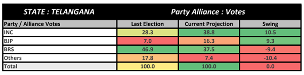 Telangana: Telangana, under the leadership of the Telangana Rashtra Samithi (now Bharat Rashtra Samithi) for a decade, may experience a close contest, possibly leading to a hung assembly. The Congress is projected to secure 48-60 seats in the 119-seat assembly, while the BRS may win 43-55 seats. The majority mark is set at 60.