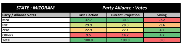 Mizoram: A hung assembly is also anticipated in Mizoram, where the ruling Mizo National Front is projected to win 13-17 seats, compared to INC’s 10-14. The majority requirement in the 40-member assembly is 21.
