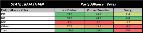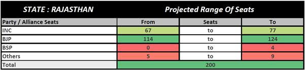The BJP is potentially set for a significant victory, with 114-124 seats out of the total 200 and a 44.8 percent vote share.