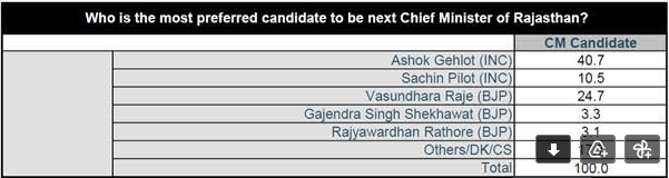 Despite dissatisfaction with his government, Ashok Gehlot remains the most favored Chief Minister candidate with 40.7 percent of respondents endorsing him.