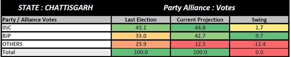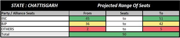 The ruling Congress is projected to win 45-51 seats out of the 90-seat assembly with a 44.8 percent vote share.