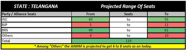 Seat projections place BRS slightly ahead with an estimated 49-61 seats, while the Congress is expected to secure 43-55 seats in the 119-seat House.