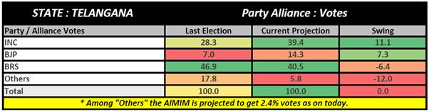 The ruling Bharat Rashtra Samithi (BRS) is expected to receive a 40.5 percent vote share, with Congress at a close 39.4 percent.