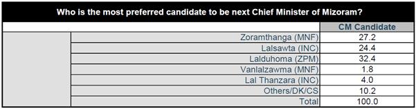 ZPM’s Lalduhoma is the most favored candidate for the Chief Minister post, with 32.4 percent of respondents support.