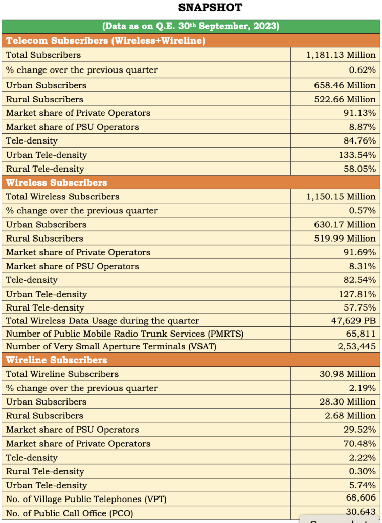 With a net increase of 6.57 million subscribers during the quarter under review, the total wireless subscriber base increased from 1,143.58 million at the end of June-23 to 1,150.15 million at the end of Sept-23, registering a growth 0.57 percent over the previous quarter.