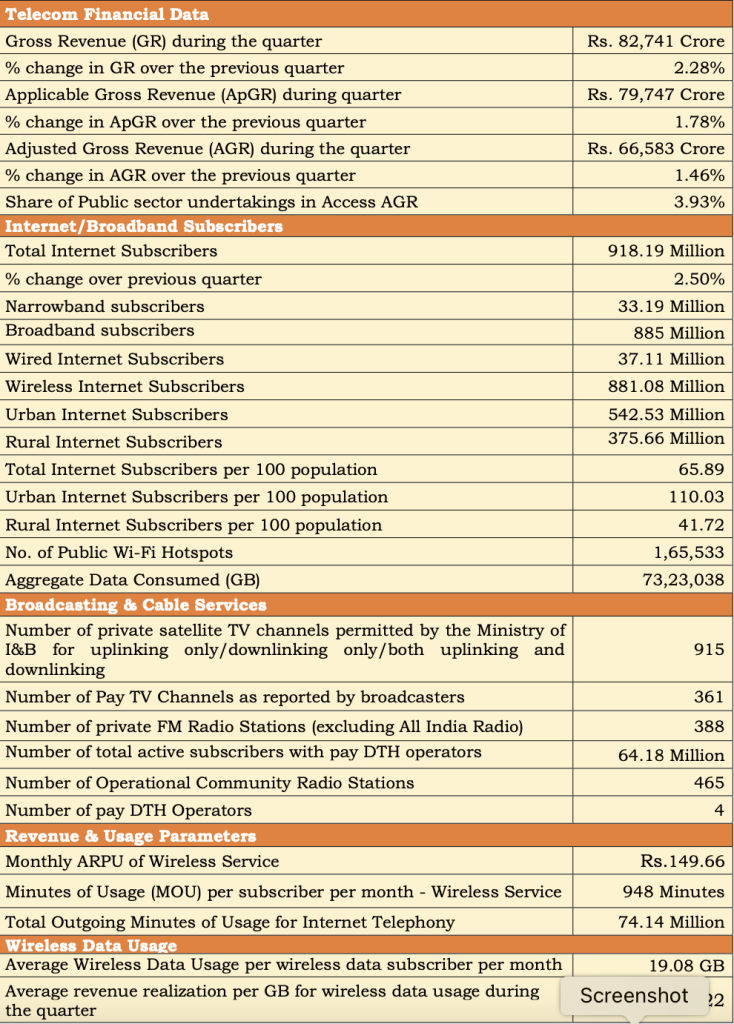 Out of 918.19 million internet subscribers, the wired internet subscriber number stood at 37.11 million,. while wireless internet subscriber base totalled 881.08 million.