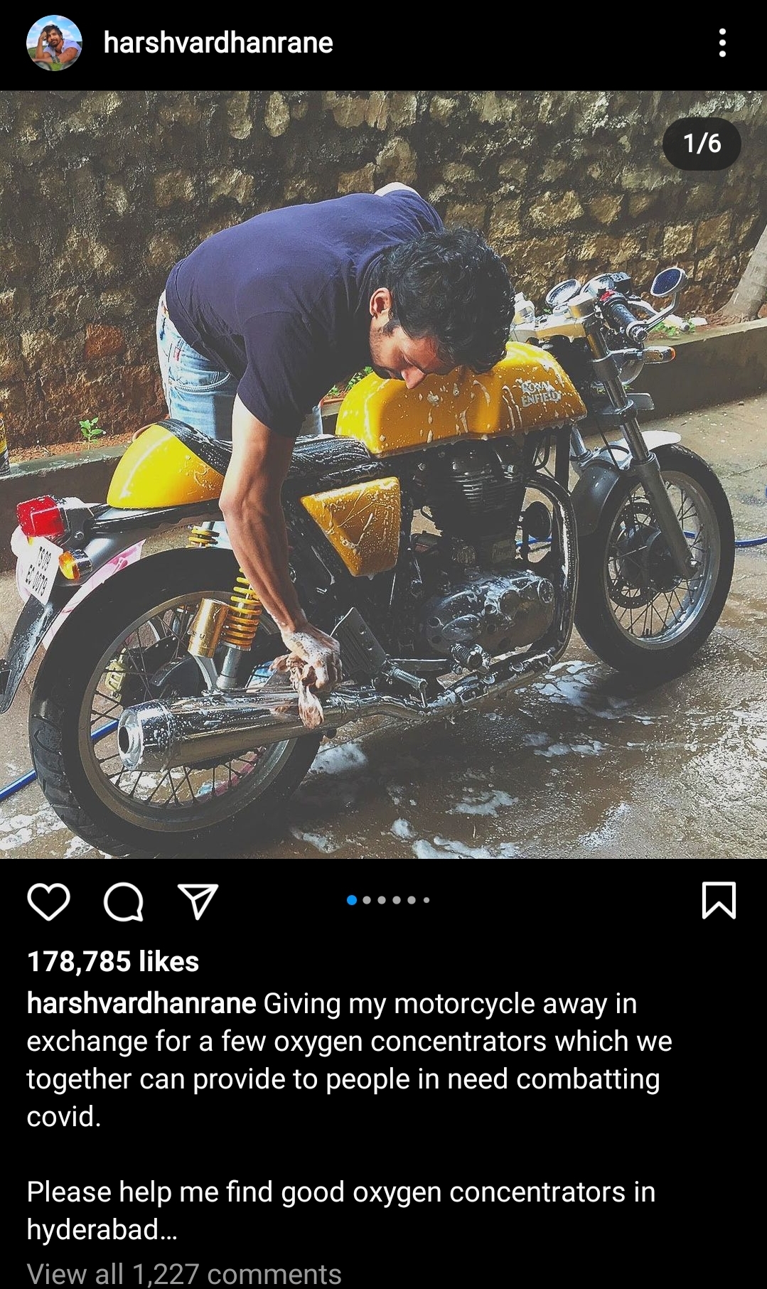 Actor Harshvardhan Rane has announced that he will be selling his motorcycle to buy a few oxygen concentrators that will be used to help those who are suffering from COVID-19 infection and cannot survive without medical oxygen.