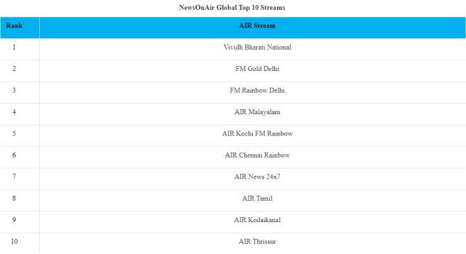 In major changes in rankings of top AIR streams globally (excluding India), AIR Kodaikanal has made a comeback, after displacing AIR Ananthapuri from Top 10.