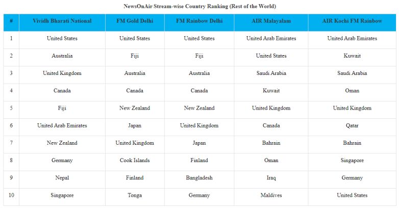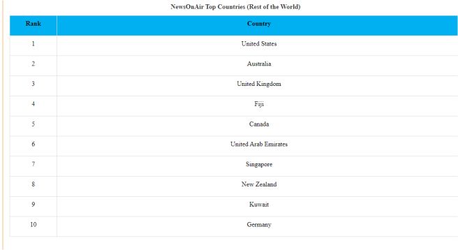 In the latest rankings of top countries in the world (excluding India) where All India Radio Live-streams on NewsOnAir App are most popular, New Zealand has toppled Germany to take the 8th position, while United Kingdom has pulled down Fiji to 4th position, reinstating itself in top 3.