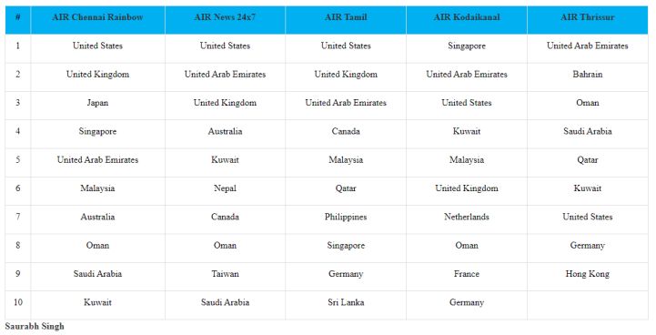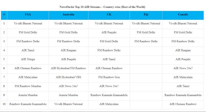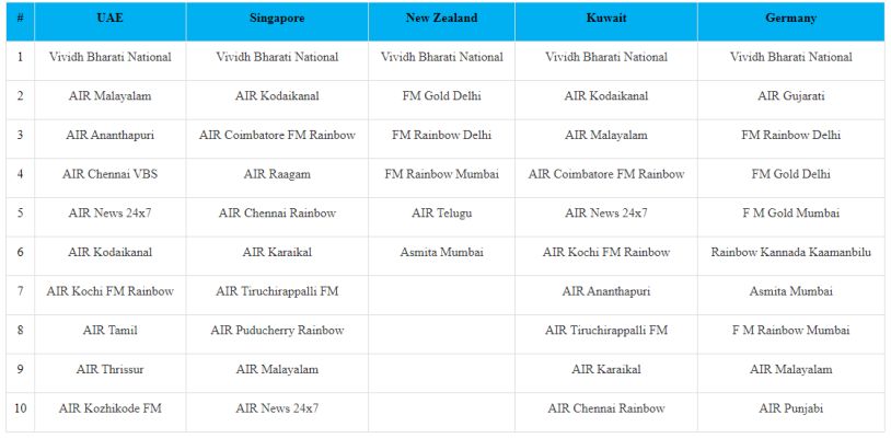 In ranking of countries (excluding India) for the Top AIR streams, AIR Tamil is quite popular in Southeast Asian countries of Malaysia, Philippines and Singapore. Vividh Bharati National, FM Gold Delhi and FM Rainbow Delhi are favourites in the island country Fiji located in the Continent Oceania.