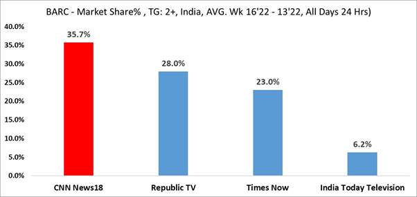 CNN-News18 outperformed top news channels such as Republic TV, Times Now, India Today TV, and others. The market share of Republic TV stood at 28 percent, whereas the market share of Times Now was at 23 percent and India Today TV was at 6.2 percent.