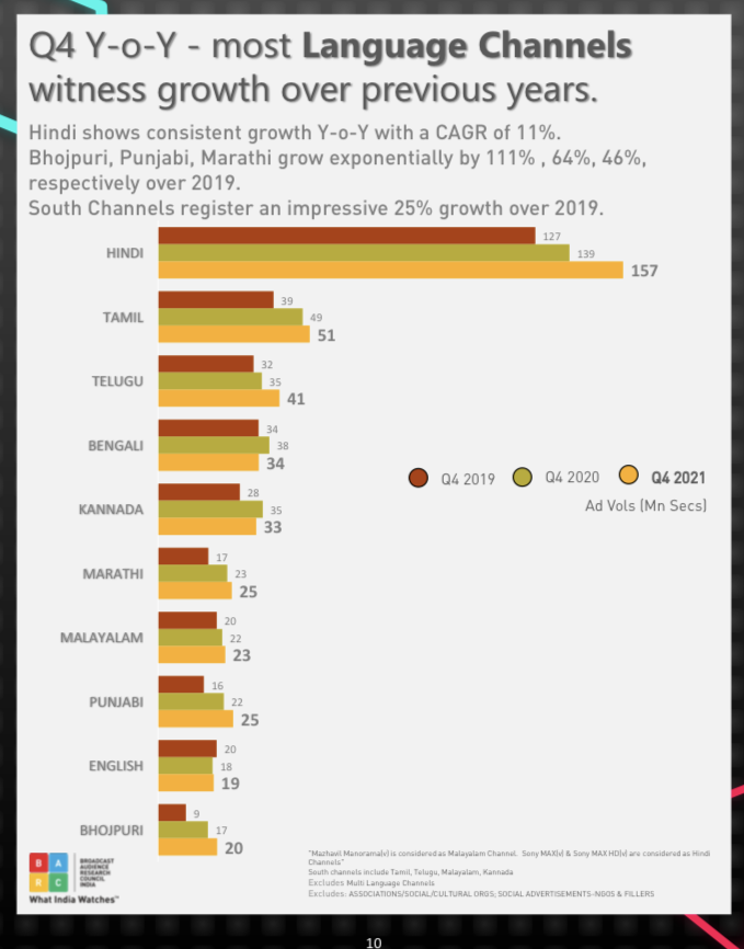 • Ad volumes on South Indian language channels— Tamil, Telugu, Malayalam and Kannada — registered 25 percent growth in Q4 2021 over Q4 2019.