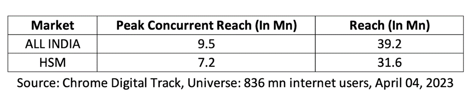 According to the data sourced from Chrome Digital Track, on April 4, the match was watched by almost 39.2 million unique viewers across India where it managed to capture 9.5 million concurrent viewers at peak viewing times. Across the HSM (Hindi-speaking markets), the content was consumed by 31.6 million unique viewers.