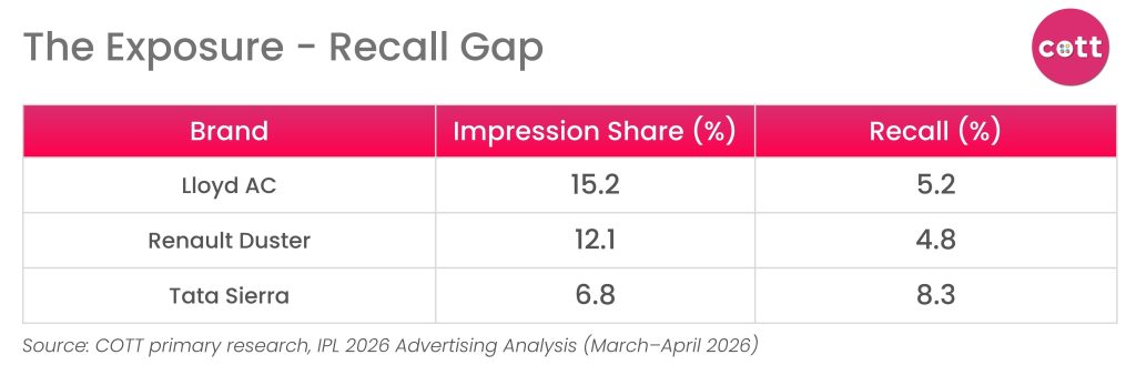 One of the most striking examples from the study was Tata Sierra, which recorded the highest recall at 8.3 per cent despite having a relatively modest impression share of 6.8 per cent. In contrast, Lloyd AC led in exposure with 15.2 per cent but managed only 5.2 per cent recall, while Renault Duster posted 12.1 per cent visibility with just 4.8 per cent recall. The data points to a widening gap between exposure and effectiveness when creative execution fails to resonate.
