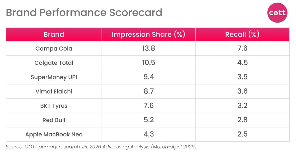 A more balanced performance was seen with Campa Cola, which combined 13.8 per cent exposure with a strong 7.6 per cent recall, emerging as a case study in aligning creative storytelling with media reach. Other brands such as Colgate Total, SuperMoney UPI, Vimal Elaichi, and BKT Tyres maintained steady visibility but lagged in recall, indicating limited differentiation in messaging.