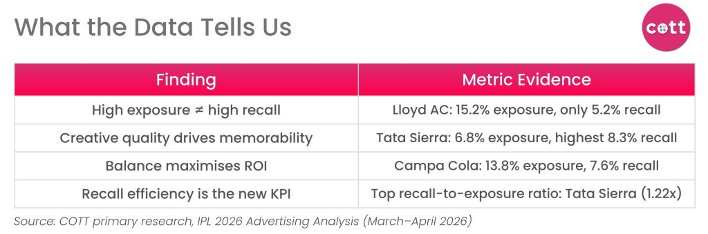 The report suggests that recall efficiency is fast becoming a critical KPI for advertisers, particularly in environments where multiple brands compete simultaneously for viewer attention. As the IPL continues to be one of the most cluttered advertising platforms, the study indicates that only campaigns with distinctive and engaging creative can cut through the noise and deliver real brand impact.