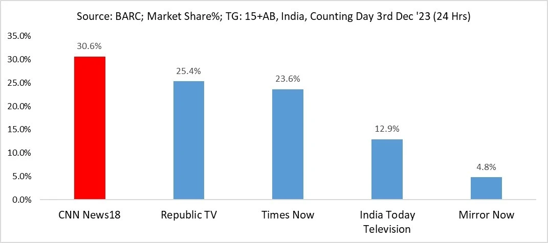 CNN-News18 has reaffirmed its commanding presence in the English News segment, securing an impressive 30.6 percent market share on the Counting Day of assembly elections across Rajasthan, Madhya Pradesh, Chhattisgarh, and Telangana on December 3, 2023, according to the Broadcast Audience Research Council (BARC).