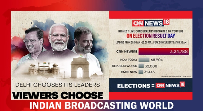 CNN-News18 emerged as the top choice for English news viewers during the high-stakes Delhi Assembly Election Counting Day, registering a record-breaking 3,24,788 peak concurrent viewers on YouTube at 09.35 am. The channel’s unmatched coverage and real-time analysis positioned it far ahead of its competitors, solidifying its dominance in the English news segment.