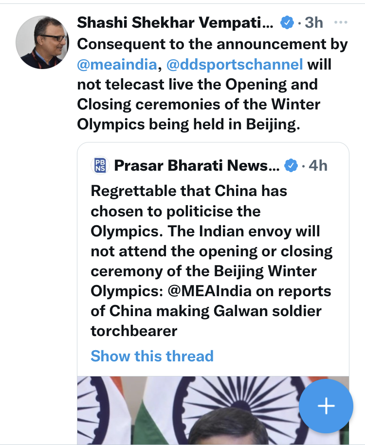 “Consequent to the announcement by @meaindia, @ddsportschannel will not telecast live the Opening and Closing ceremonies of the Winter Olympics being held in Beijing,” tweeted Shashi S. Vempati, CEO of Prasar Bharati, which is the parent of Doordarshan and All India Radio.