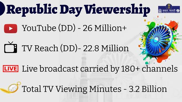 These figures together indicate the scale of Doordarshan network’s reach, the pubcaster said in a statement Friday. This was further amplified by the fact that the R-day coverage notched up more than 3.2 billion TV viewing minutes across 180+ TV channels (privately-owned included) across the country that carried Doordarshan visuals from 9.30 am till noon.