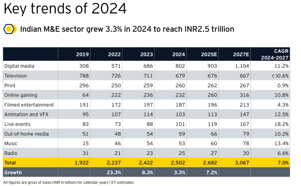 The Indian M&E sector is expected to grow by 7.2 percent in 2025, reaching INR2.7 trillion (US$31.6 billion), and then expand at a CAGR of 7 percent to reach INR3.1 trillion (US$36.1 billion) by 2027. This growth trajectory is poised to be shaped by innovative business models, strategic alliances, and industry consolidation.