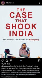 Ekta shared on Instagram, “Time for Verdict2. The People v/s Indira Gandhi. A woman of worth admiration and critique. Our most ambitious story to tell.. based on these in-depth stellar books.” She shared the cover images of two books along with the caption – The Case that Shook India and Emergency Retold.
