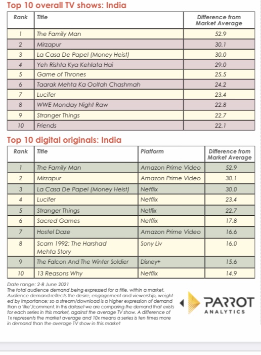 The media magazine reported that during the 2-8 June week The Family Man 2, headlined by Manoj Bajpayee, debuted and accounted for the show’s 52.9 percent difference from the average demand for titles tracked by Parrot Analytics in India for the week.