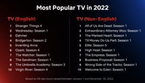 Five of the Top 10 most popular English language series of all time premiered this year on Netflix —- ‘Stranger Things 4’, ‘Wednesday’ and ‘Monster: The Jeffrey Dahmer Story’ (all of which crossed the 1 billion hours viewed mark), ‘Bridgerton’ S2 and ‘Inventing Anna’.