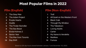Three of Netflix’s Top 10 most popular English language films of all time premiered this year, which included ‘The Adam Project’, ‘The Gray Man’ and ‘Purple Hearts’. It also released the most successful animated kids film with ‘The Sea Beast’ and the successful documentary feature, ‘The Tinder Swindler’.