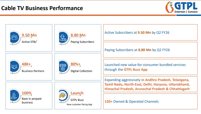 Breaking down the segmental performance, revenue from the cable TV business stood at Rs.802.64 crore, while internet services contributed Rs.140.11 crore during the second quarter of FY26. The company continues to expand its broadband footprint across regional markets, with sustained growth in data consumption and subscriber additions aiding its internet services revenue.