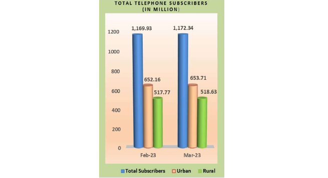 The number of telephone subscribers in India increased from 1,169.93 million at the end of February-23 to 1,172.84 million at the end of March-23, thereby showing a monthly growth rate of 0.21 percent.