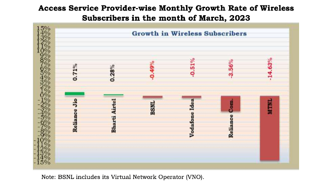 Total wireless subscribers increased from 1,141.96 million at the end of February-23, to 1,143.93 million at the end of March-23, thereby registering a monthly growth rate of 0.17 percent.
