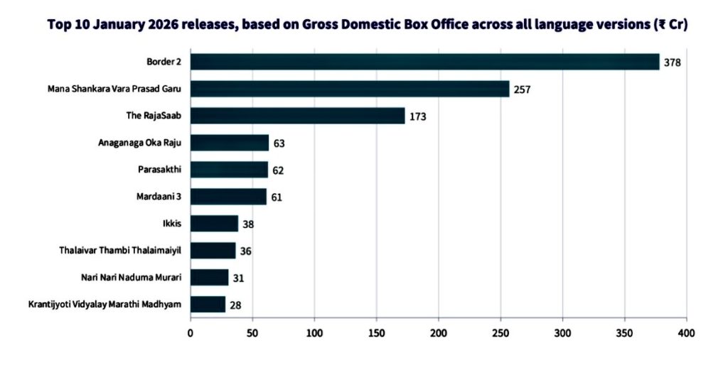 The Ormax Media monthly India Box Office Report report said ‘Border 2’ topped the box office with a gross of Rs. 378 crore, while the festive Sankranthi window boosted performance for Telugu cinema. Five major Telugu titles, spearheaded by Mana Shankara Vara Prasad Garu, contributed more than Rs. 500 crore collectively, underlining the importance of holiday releases.