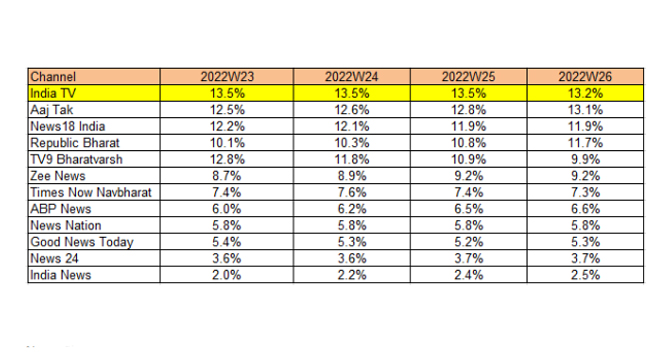 The data for India Tv and other channels are for BARC Week26 of 2022, All Days, 0600 Hrs to 2400 Hrs, TG: 15+, Market: HSM.