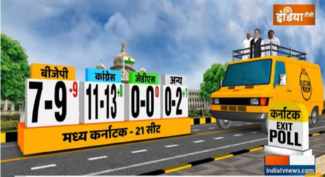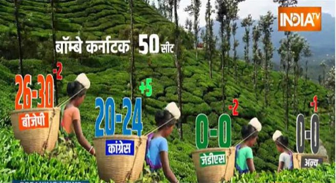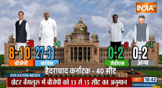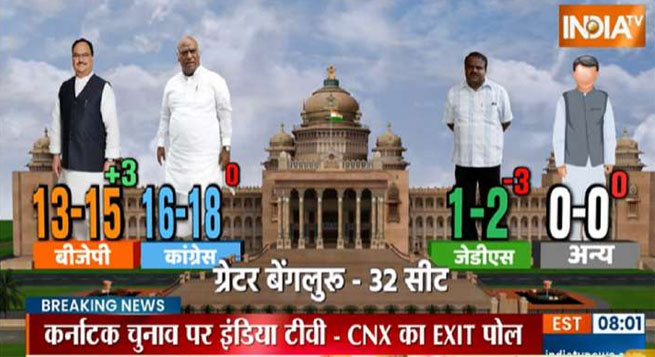 The India TV-CNX poll projections region-wise show, Congress may get 17 seats, BJP may get 14 seats, and JD(S) may get one seat in Greater Bangalore (total of 32 seats).