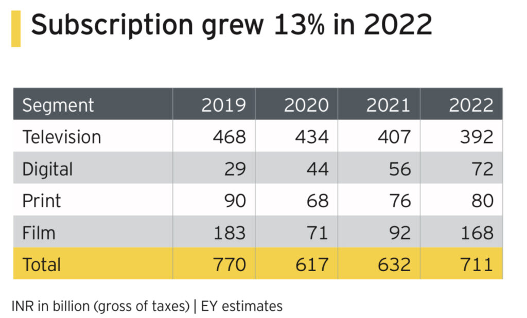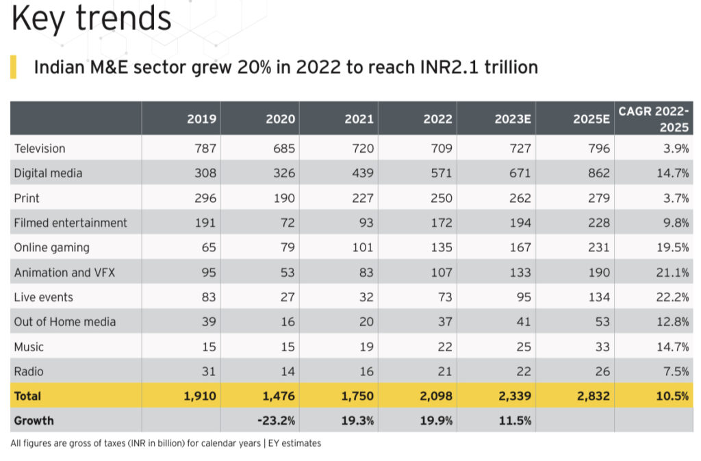 The Indian media and entertainment (M&E) sector grew 20 per cent in 2022 to reach Rs 2.1 trillion, 10 per cent above its pre-pandemic levels in 2019, according to a Ficci-EY report released yesterday.