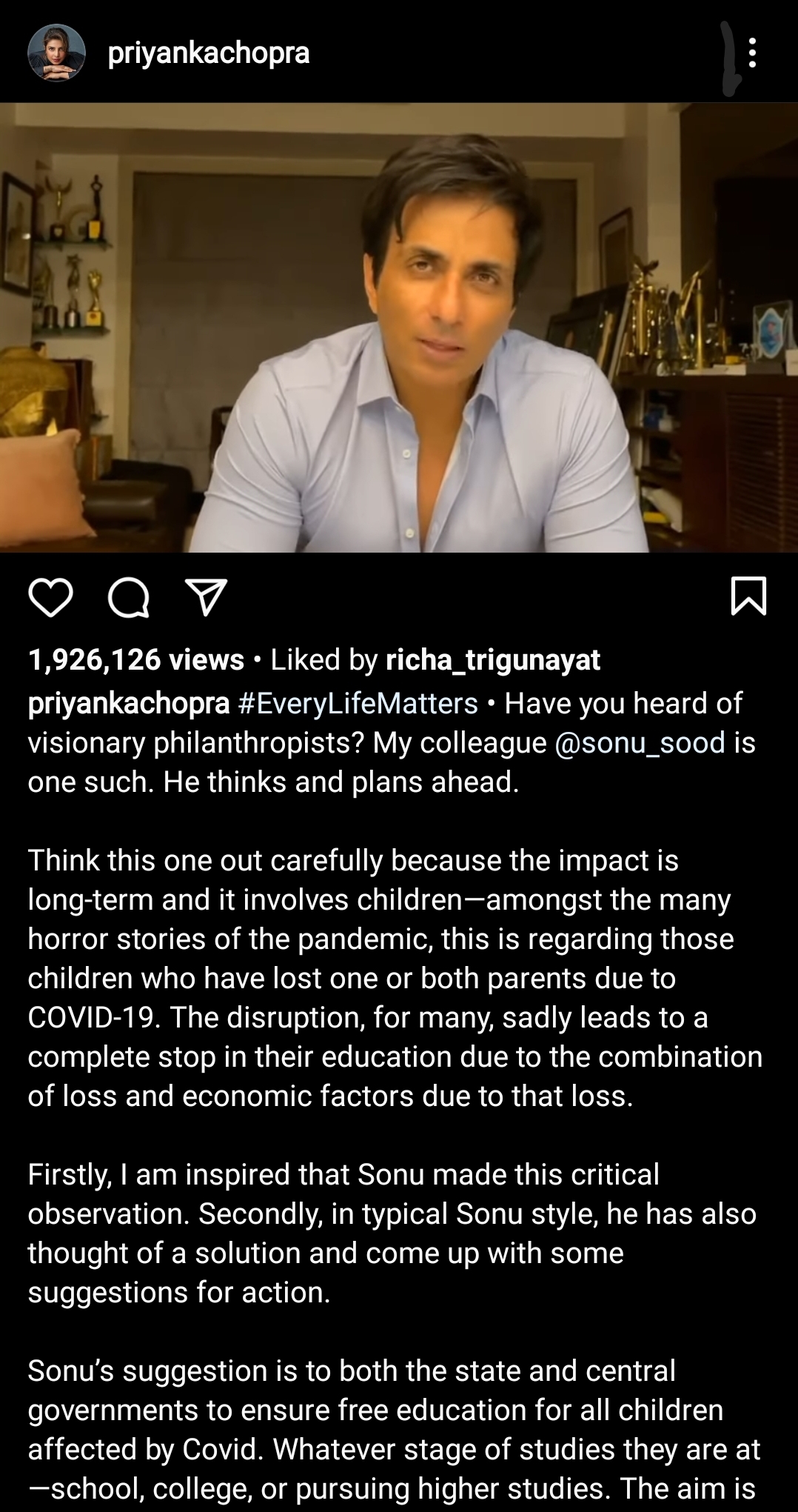 Global Icon and Bollywood actress Priyanka Chopra Jonas praised Sonu Sood, and amplified his recent video wherein he appealed to the Indian government to make education free for children who’ve lost their parents to COVID-19.