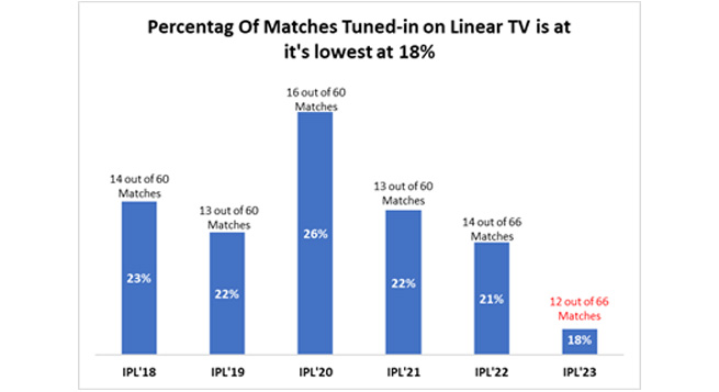 The current season of the TATA Indian Premier League 2023 (IPL) has seen a significant drop in TV ratings. Along with declining viewership, the number of advertisers on Linear TV is decreasing this year.