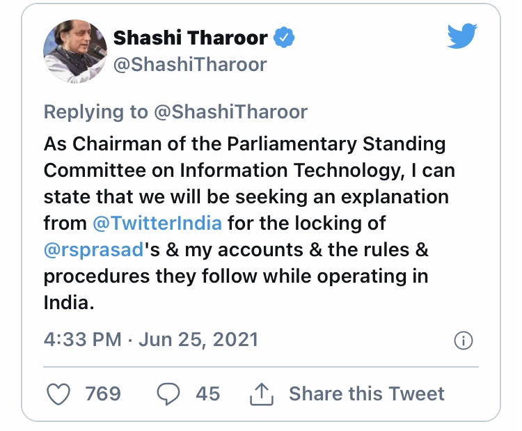 He further added: “As Chairman of the Parliamentary Standing Committee on Information Technology, I can state that we will be seeking an explanation from @TwitterIndia for the locking of @rsprasad’s & my accounts & the rules & procedures they follow while operating in India.”