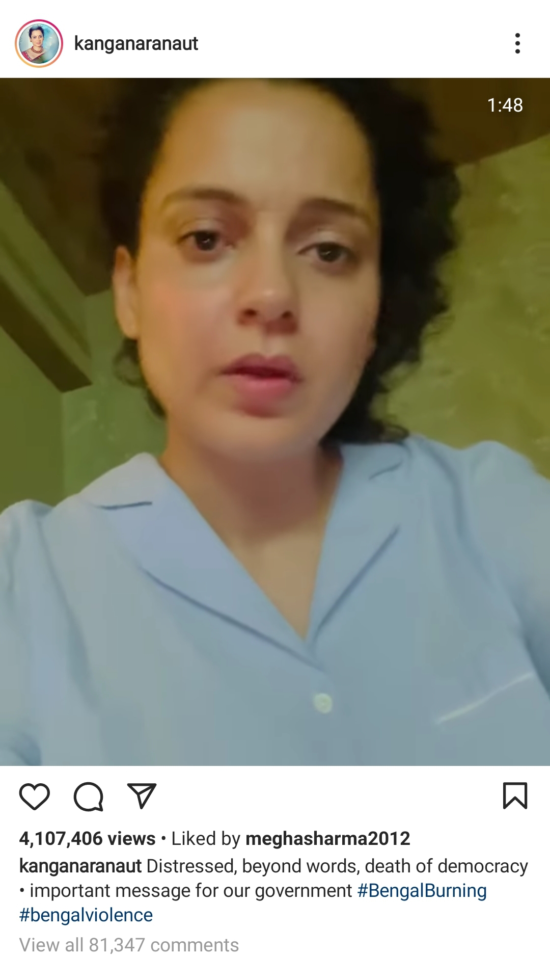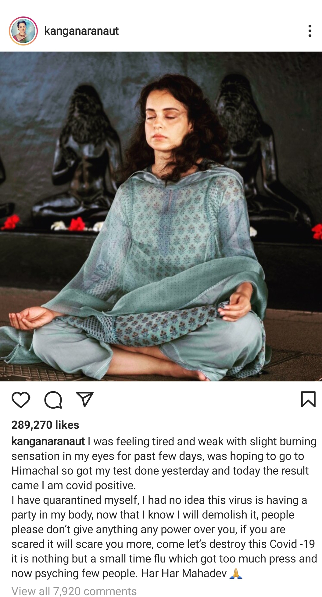 Kangana Ranaut wrote, “I was feeling tired and weak with a slight burning sensation in my eyes for past few days, was hoping to go to Himachal so got my test done yesterday and today the result came I am covid positive.”