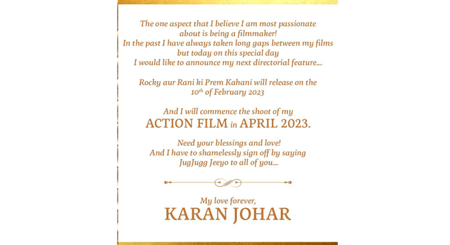 Filmmaker Karan Johar has announced his next directorial venture, an action film, which will go on floors in April 2023.